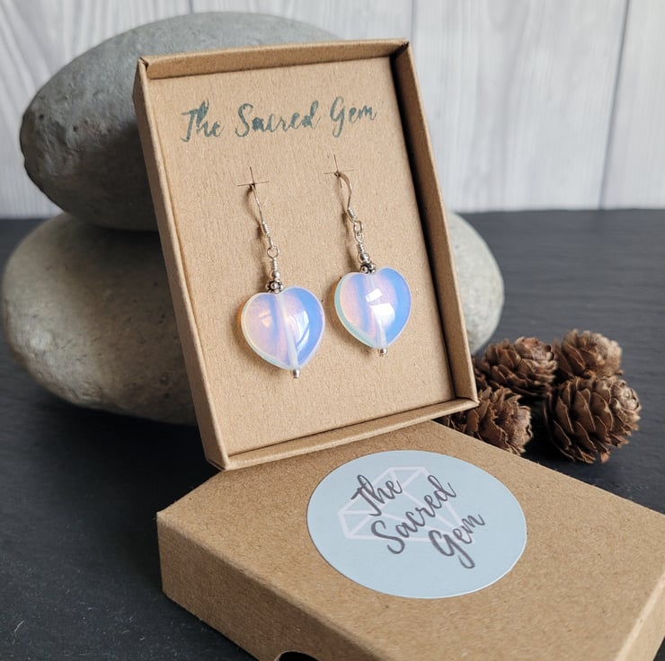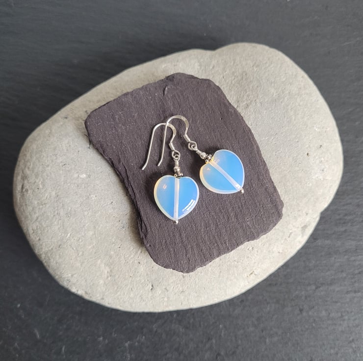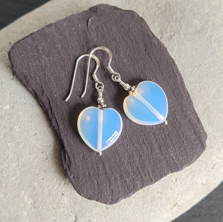 These pretty earrings are made with translucent opalite heart and sterling silver beads. All the silver elements of the earrings are sterling silver which are kinder to more sensitive ears.