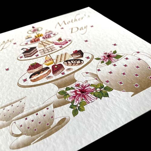 Thinking of Mother’s Day I thought of a very special afternoon tea with lots of tasty little sandwiches and gorgeous fancy cakes. I just loved painting and inventing a few of my own delicious sweet treats. Yes, all those yummy cakes are hand painted and set on a three tier cake display, which is drawn in Illustator as are the cups, saucers and teapot. The china has a beige ombre tint with tiny hand painted spaced flowers to make a pretty all over pattern. The two larger pink water-colour flowers are set with a pink glass gem to add extra sparkle.