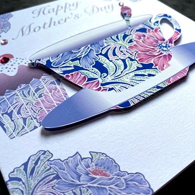 What better way to say Happy Mother’s Day than an with a cup of tea in beautiful china and a delicious cupcake! This stylised hand painted floral design makes a stunning china cup. Both the cup and saucer and the cup cake are drawn in Illustrator then the shapes are cut from the floral pattern in Photoshop, with parts shaded with softened ombre colours. The cup is hand-cut and set in relief on the saucer. The floral design creeps in on the corners to frame this pretty image and a little sparkle is added with pink glass gems.