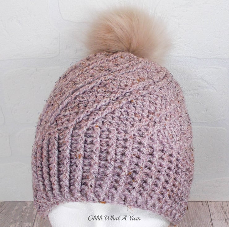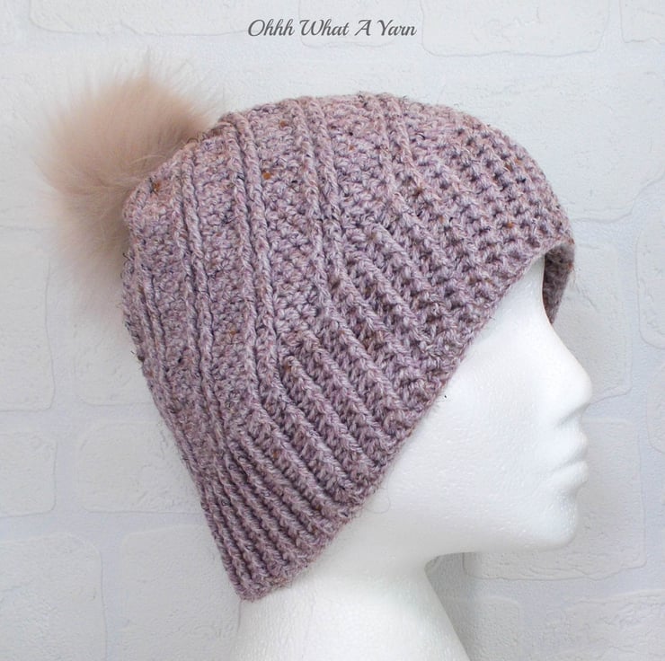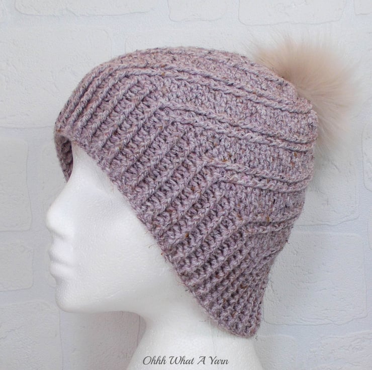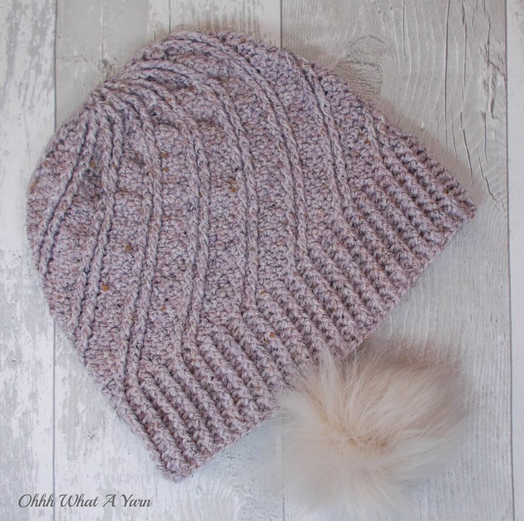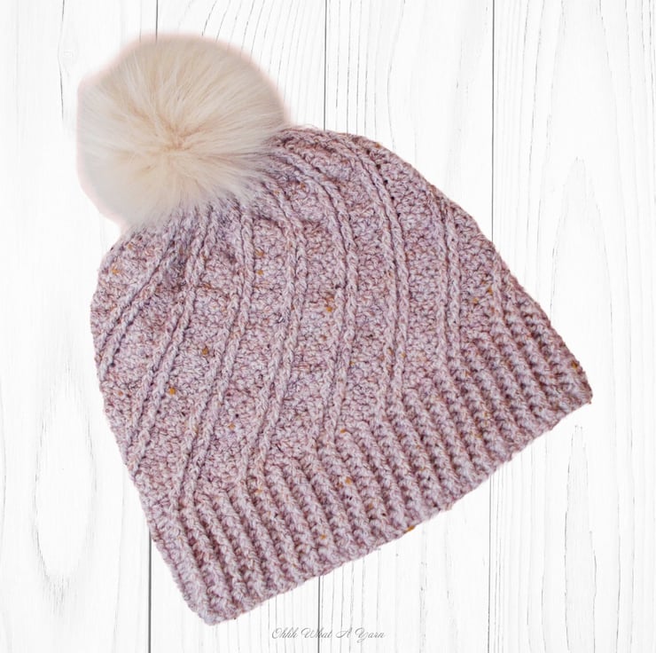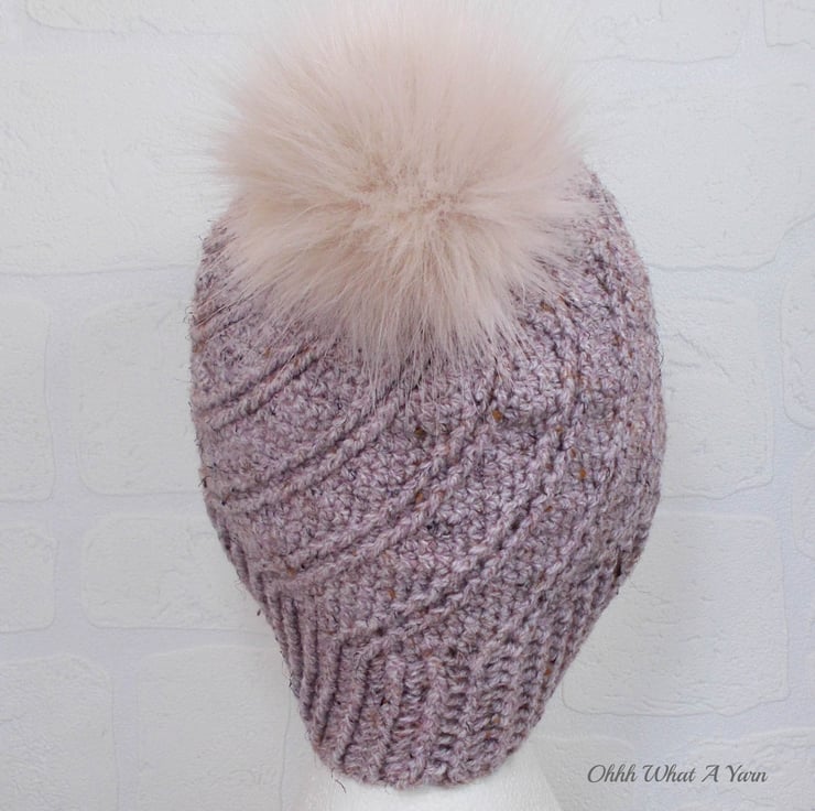 It has a gorgeous ridge pattern that creates a fabulous swirl effect and a ribbed edging. I have added a faux fur pom pom. There is a button on the inside of the hat so you can easily remove the pom pom by unhooking the loop around the button if you prefer your hat fluffless and for washing purposes.