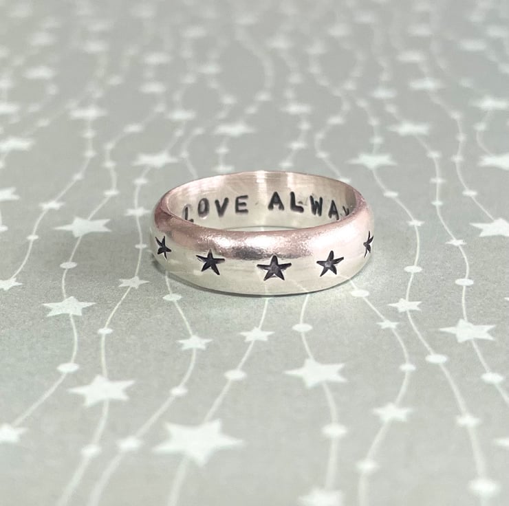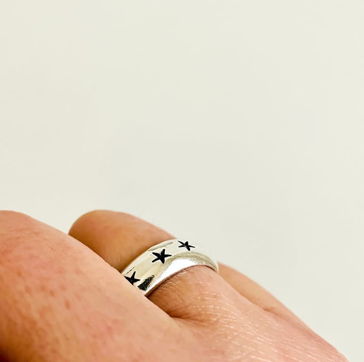 Beautiful satin finish sterling silver ring with stars stamped around it.