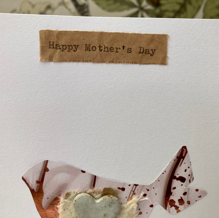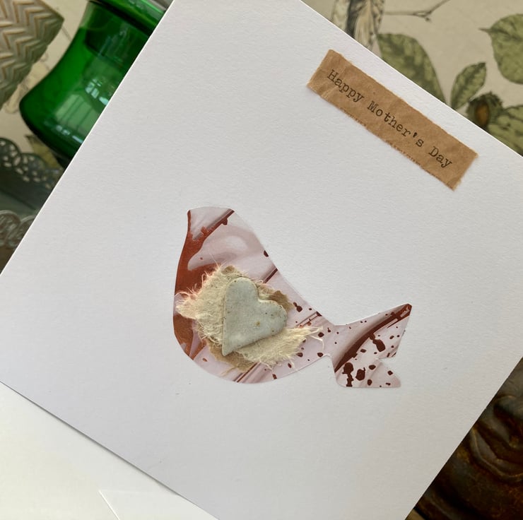 Mothers day card, hand made with attached ceramic Love heart on bird