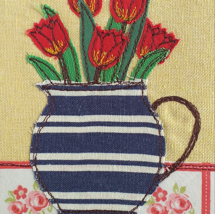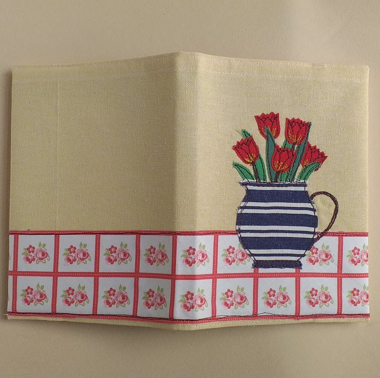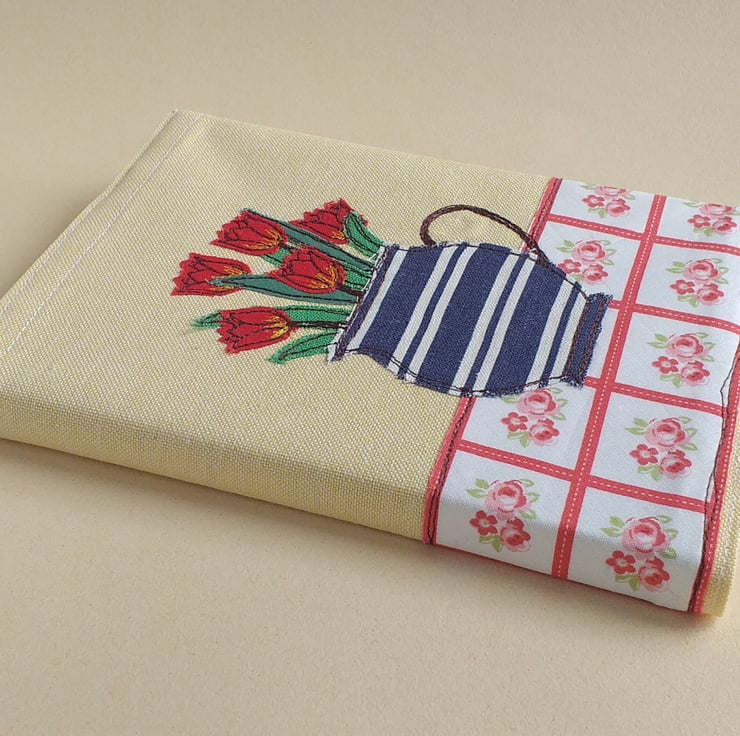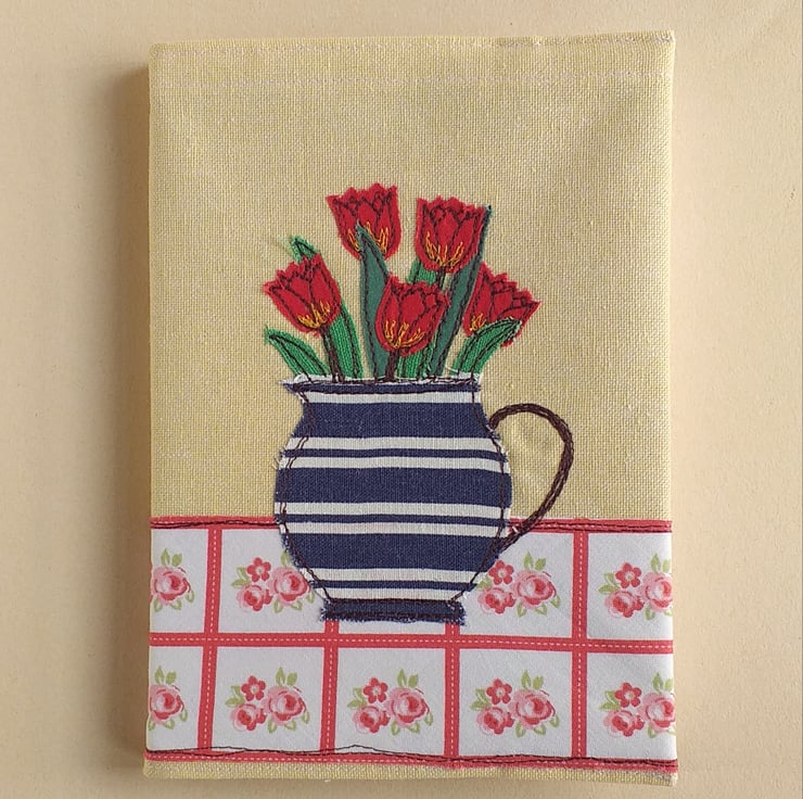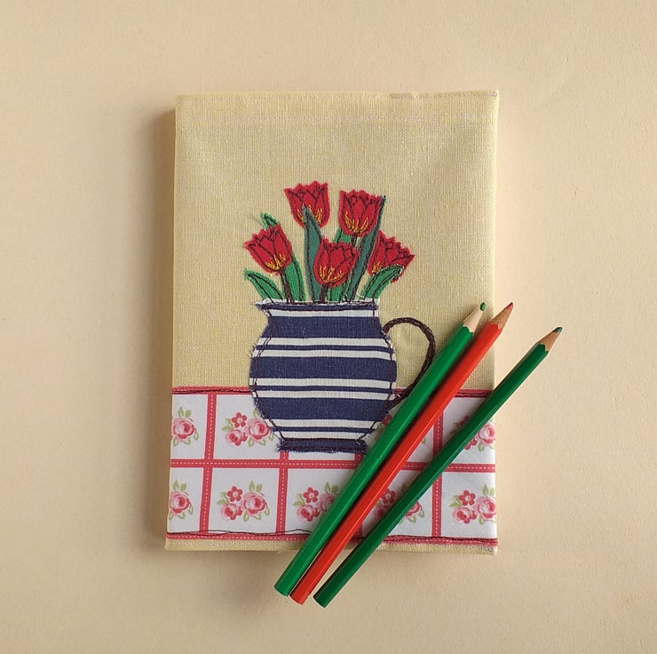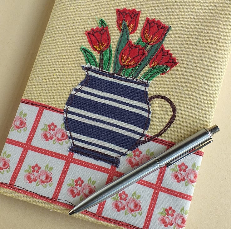 A pretty and practical notebook with a removable cover. The cover is made from yellow linen and appliqued with a blue and white jug full of red tulips. The design is made using free motion embroidery in different coloured threads.