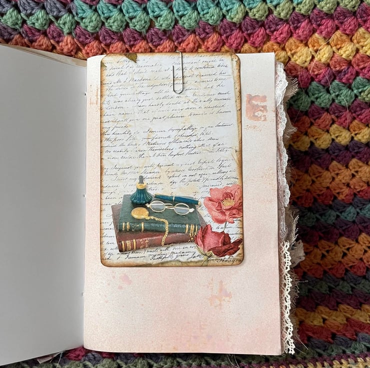 Handmade junk journal travellers notebook. Perfect for journaling, making lists, mixed media, art sketches book or just as a place to store photos and memories.