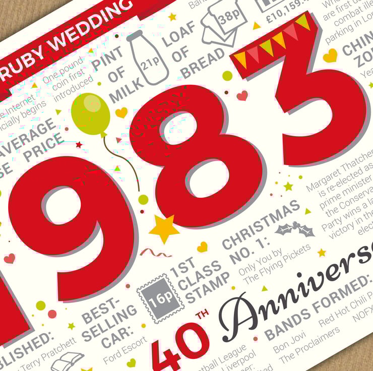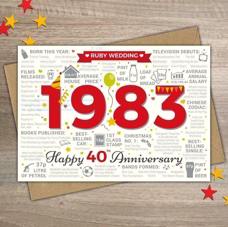 Bursting with facts from 1983, this card makes an interesting read for a Husband, Wife or happy couple who married 40 years ago and are celebrating their Ruby wedding anniversary in 2023.