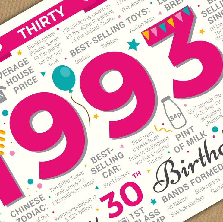 Bursting with facts from 1993, this card makes an interesting read for someone celebrating their 30th birthday in 2023.