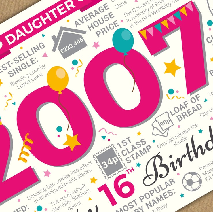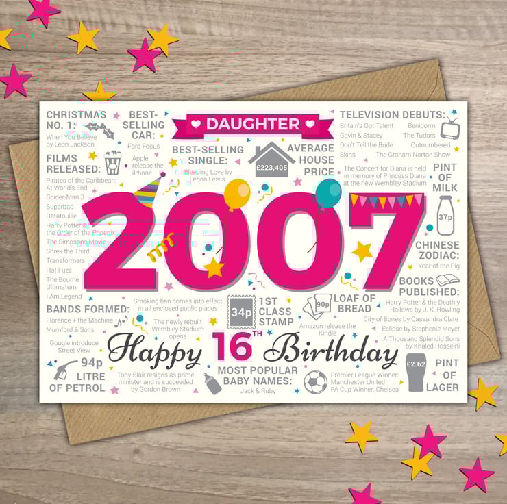 Bursting with facts from 2007, this card makes an interesting read for a Daughter celebrating her 16th birthday in 2023.