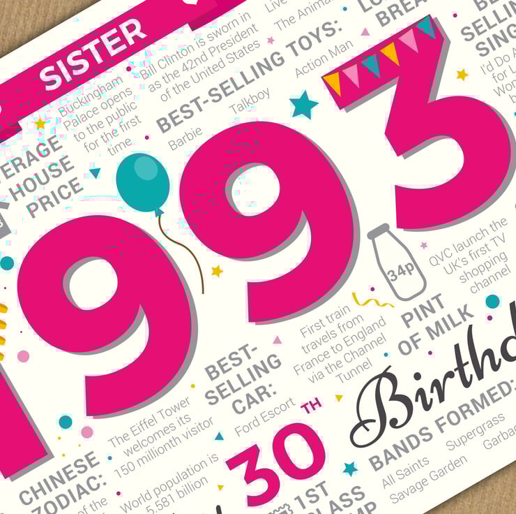 Bursting with facts from 1993, this card makes an interesting read for a Sister celebrating her 30th birthday in 2023.