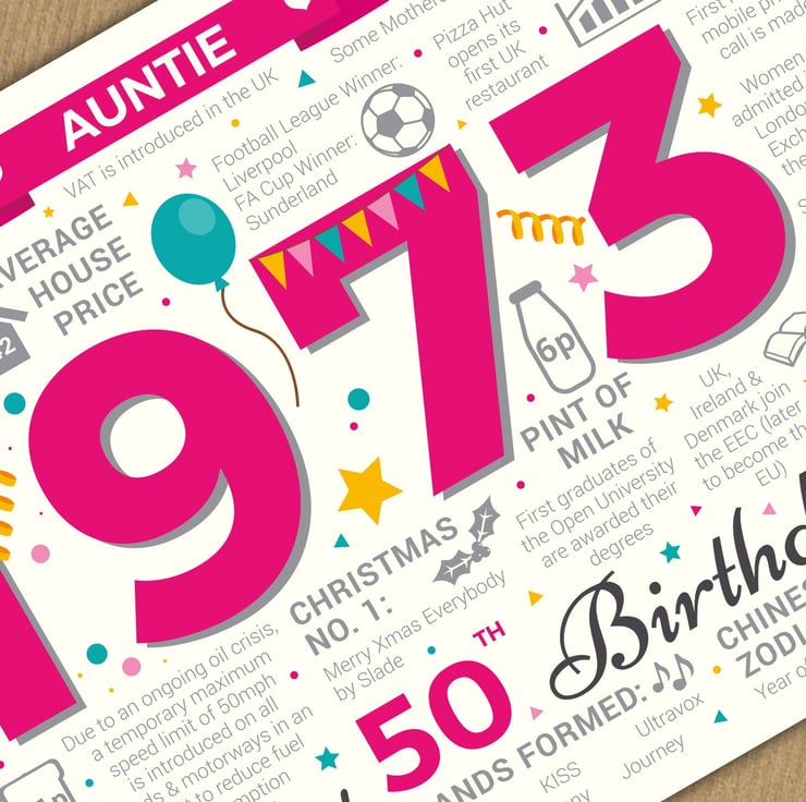 Bursting with facts from 1973, this card makes an interesting read for an Auntie celebrating her 50th birthday in 2023.