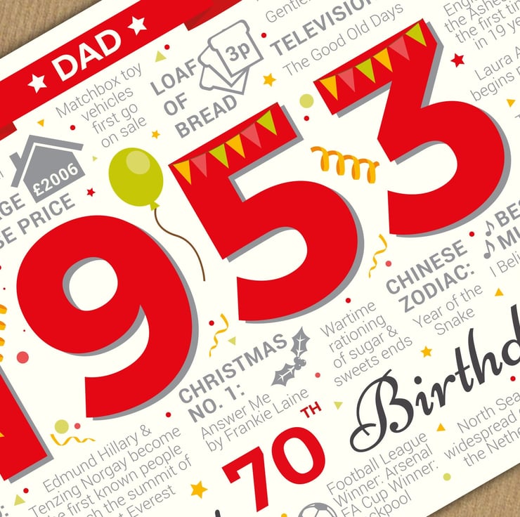 Bursting with facts from 1953, this card makes an interesting read for a Dad celebrating his 70th birthday in 2023.