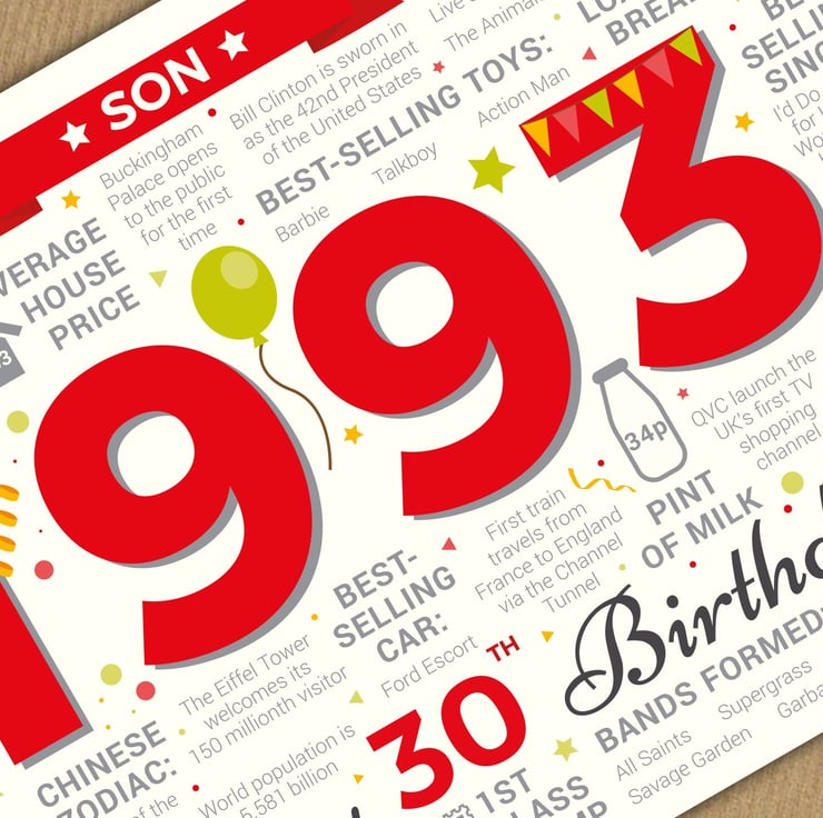 Bursting with facts from 1993, this card makes an interesting read for a Son celebrating his 30th birthday in 2023.