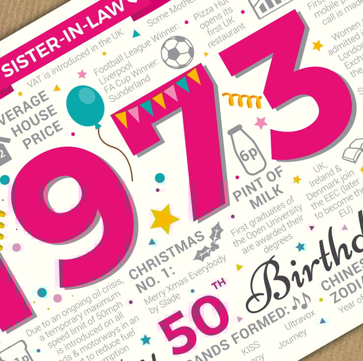 Bursting with facts from 1973, this card makes an interesting read for a Sister-in-Law celebrating her 50th birthday in 2023.