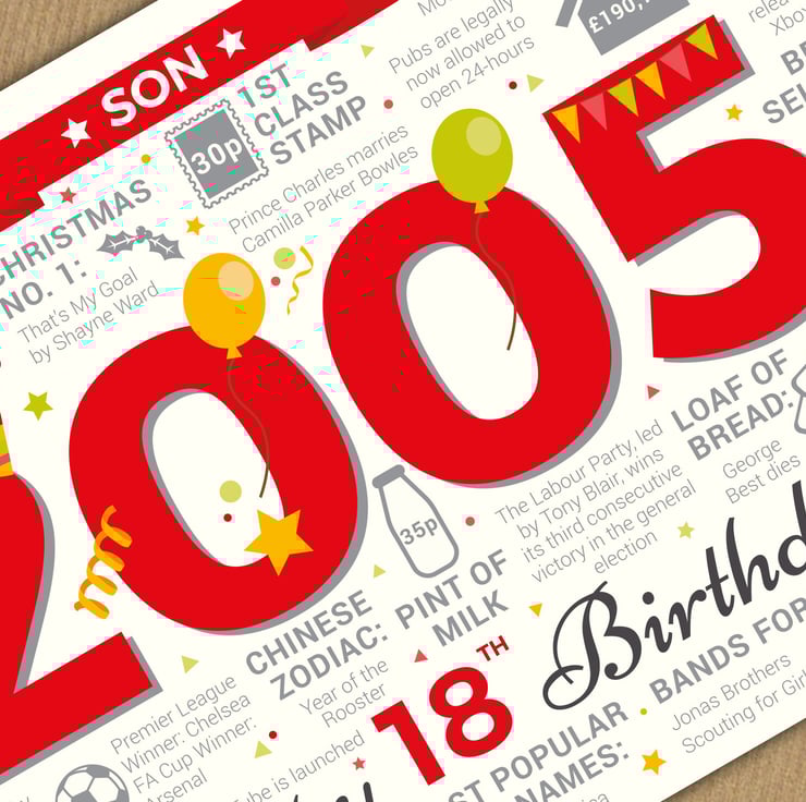 Bursting with facts from 2005, this card makes an interesting read for a Son celebrating his 18th birthday in 2023.
