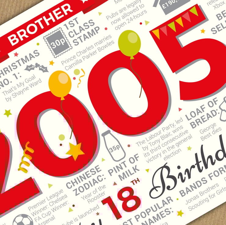 Bursting with facts from 2005, this card makes an interesting read for a Brother celebrating his 18th birthday in 2023.