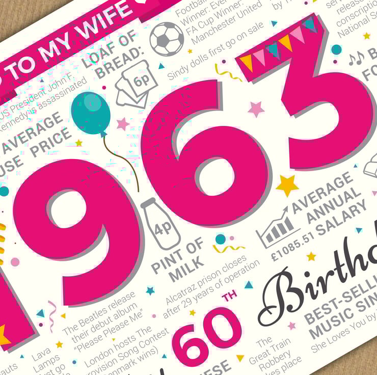 Bursting with facts from 1963, this card makes an interesting read for a Wife celebrating her 60th birthday in 2023.