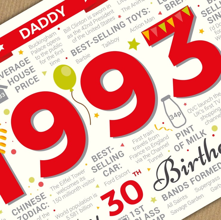 Bursting with facts from 1993, this card makes an interesting read for a Daddy celebrating his 30th birthday in 2023.
