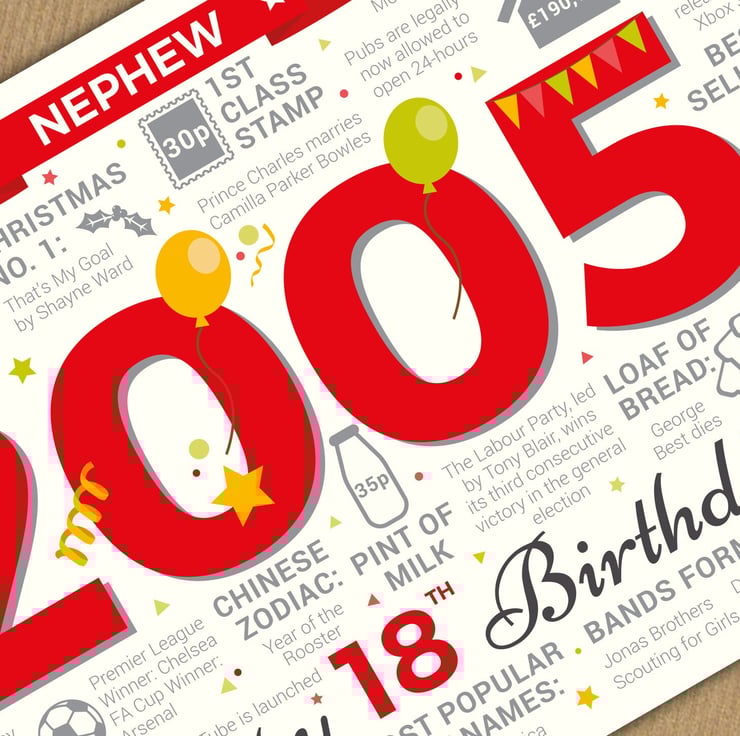 Bursting with facts from 2005, this card makes an interesting read for a Nephew celebrating his 18th birthday in 2023.