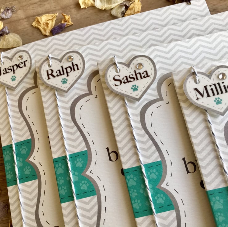Personalised with the pet's name in a heart, complete with a little gem and attached to the card with grey and white twine - please let me know what pet name to add when ordering.