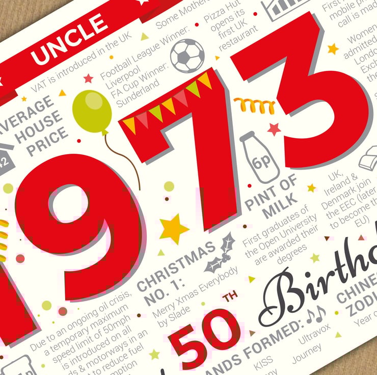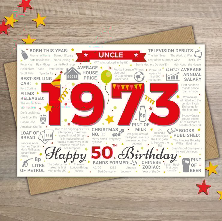 Bursting with facts from 1973, this card makes an interesting read for an Uncle celebrating his 50th birthday in 2023.