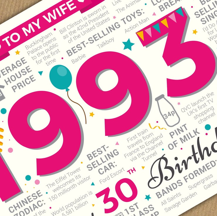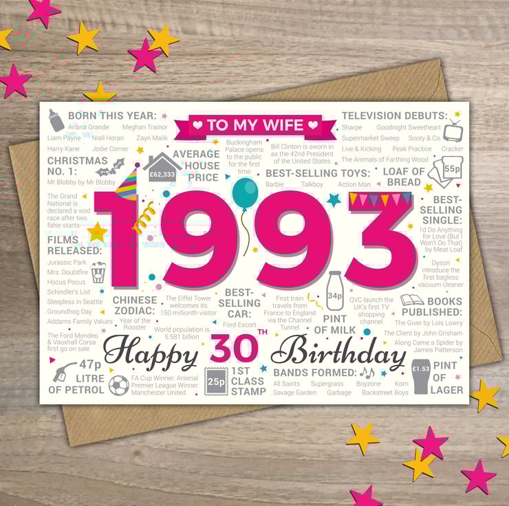 Bursting with facts from 1993, this card makes an interesting read for a Wife celebrating her 30th birthday in 2023.