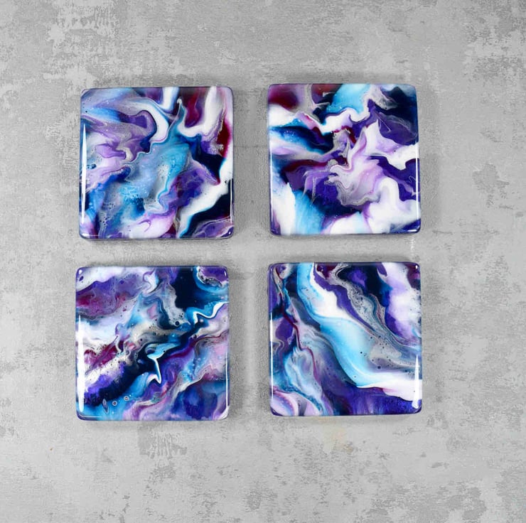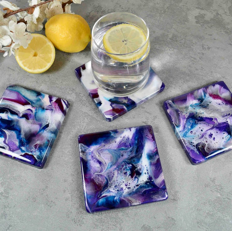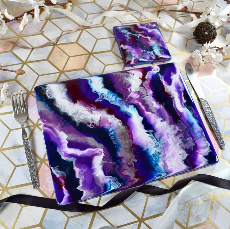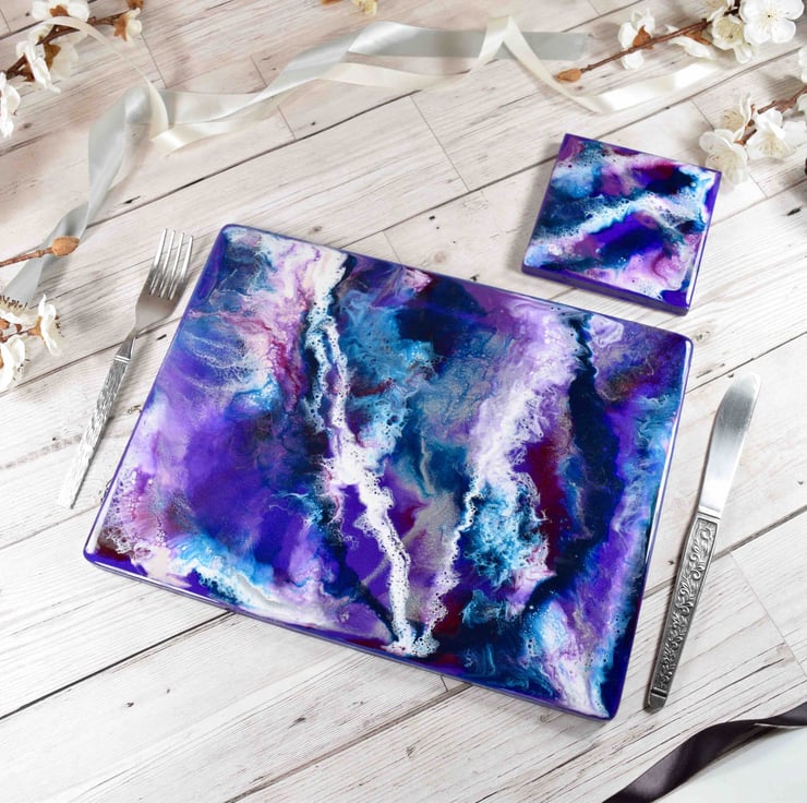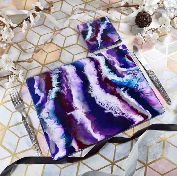 Purple resin art combined with vibrant blue, silver and white tones. A colourful way to add a contemporary twist to your dining table! Each placemat is created from scratch by myself in my art studio in Liverpool.