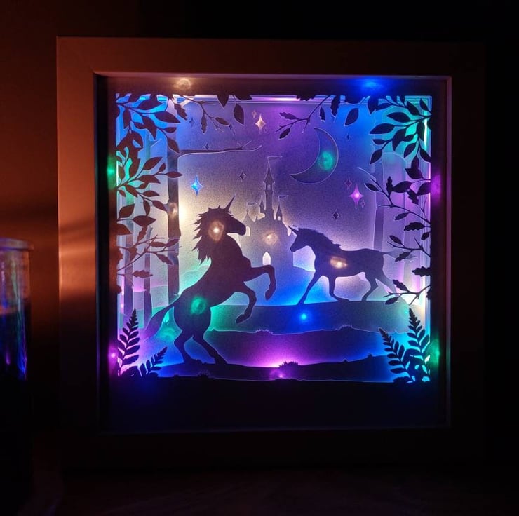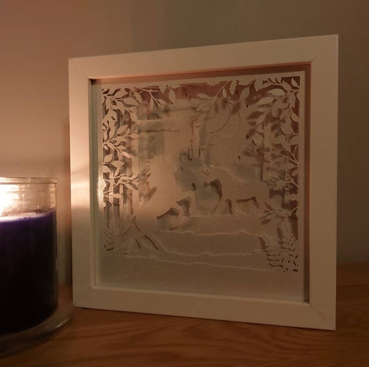 Unicorn themed shadow lightbox in 8" frame. Complete with LED lighting supplied with batteries. The layers are made up of 310gsm cardstock, layered with mountboard, to provide a 3 dimensional effect. Everyone is handmade by myself to order, so there may be small variations from the listing image, but every effort is made to keep them all as similar as possible.