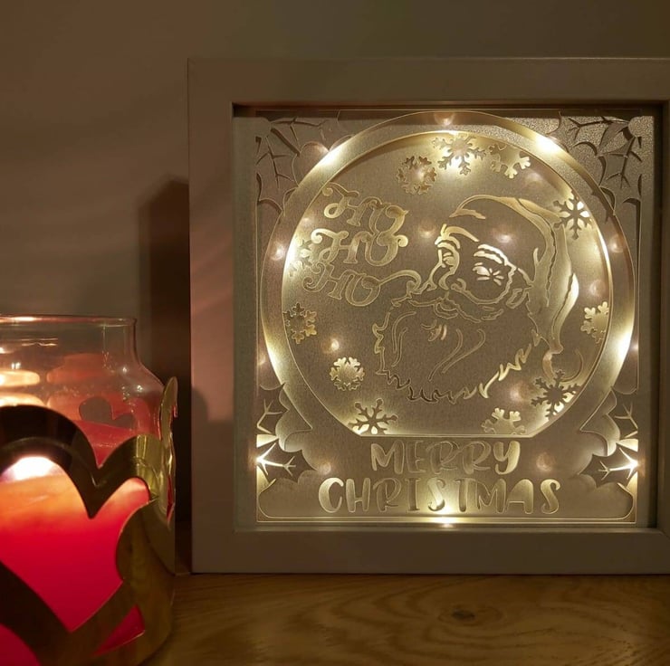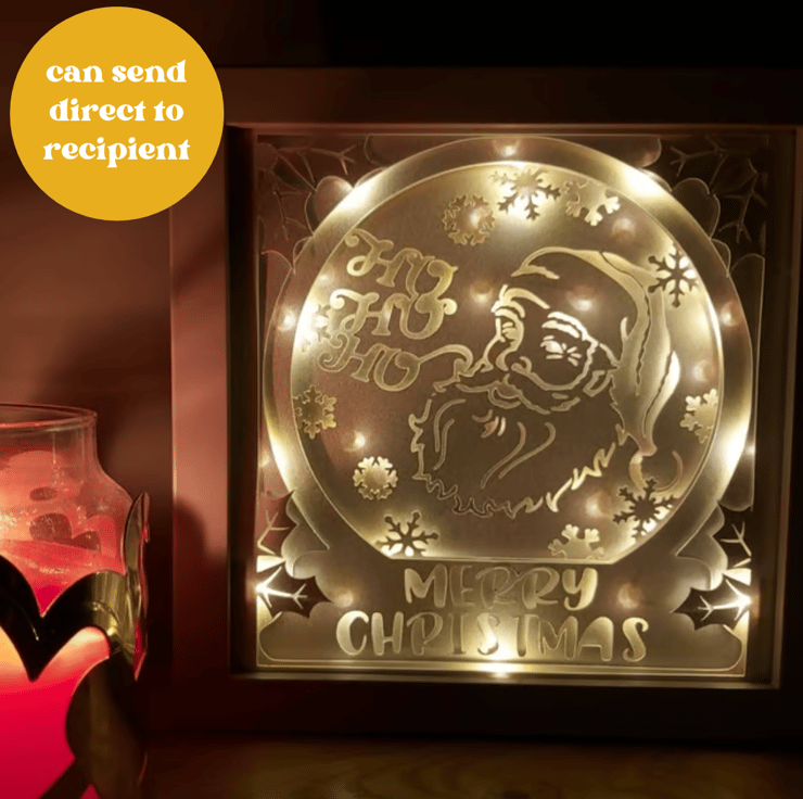Father Christmas themed shadow lightbox in 8" frame. Complete with LED lighting supplied with batteries. The layers are made up of 310gsm cardstock, layered with mountboard, to provide a 3 dimensional effect. Everyone is handmade by myself to order, so there may be small variations from the listing image, but every effort is made to keep them all as similar as possible.
