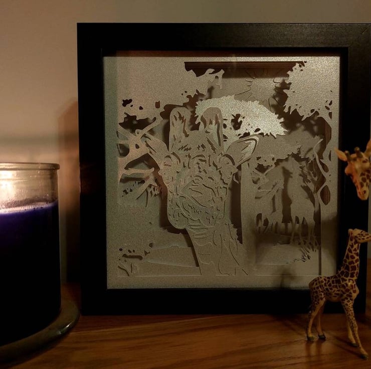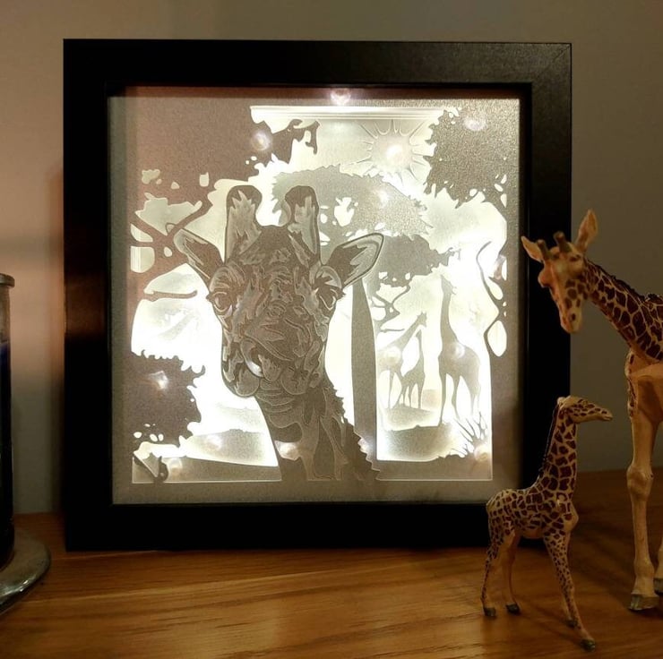 Giraffe themed shadow lightbox in 8" frame. Complete with LED lighting supplied with batteries. The layers are made up of 310gsm cardstock, layered with mountboard, to provide a 3 dimensional effect. Everyone is handmade by myself to order, so there may be small variations from the listing image, but every effort is made to keep them all as similar as possible.