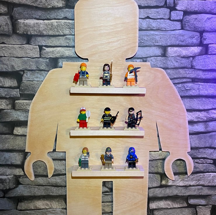 Lego figure shaped wall hangable designed where you can place a number of figure which can be attached to Lego inserts, Handmade from birch ply and pine and can be painted if you wish so great item for any kids play or bedroom