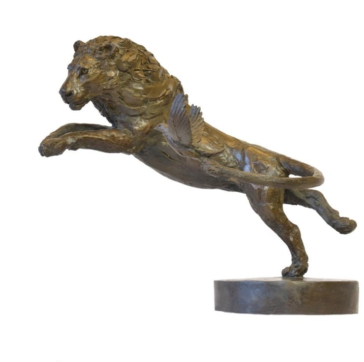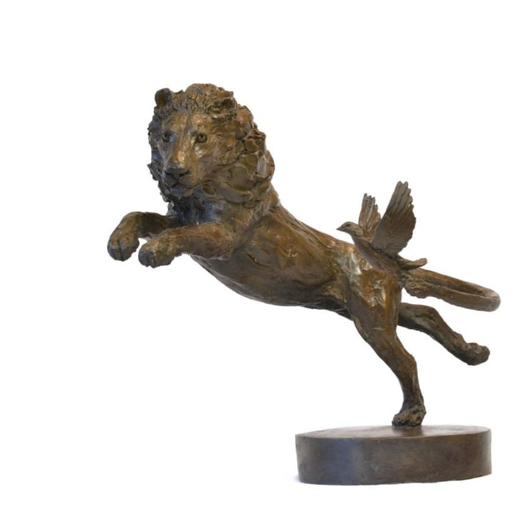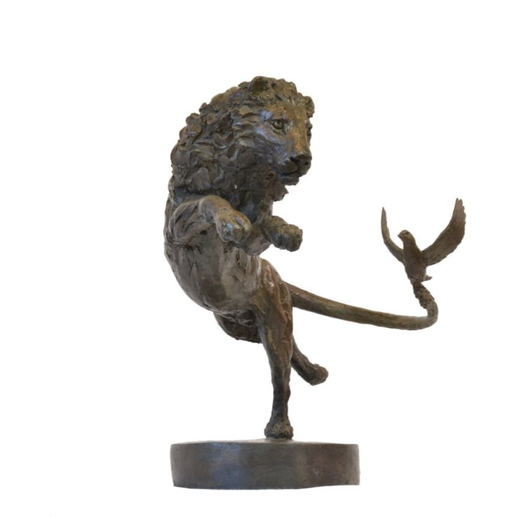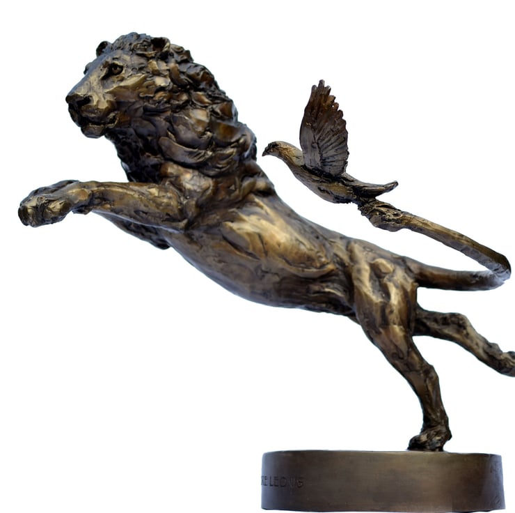 "The Lion and Dove sculpture was commissioned as an auction bid, at the Battersea Dogs and Cats Home 150th Gala Ball Auction, in order to raise money for the Home. The sculpture was for a couples golden wedding anniversary. He had a lion on his crest and he often called her his little dove. I wanted to show them going through life together, joined yet on their own journey."