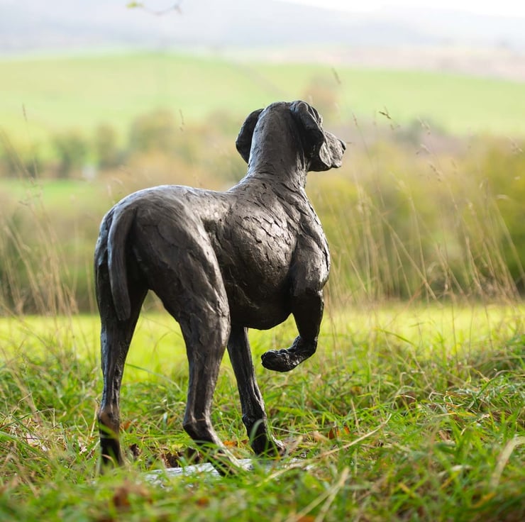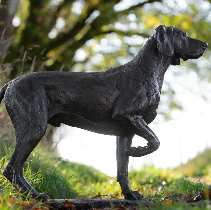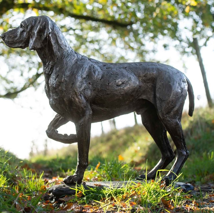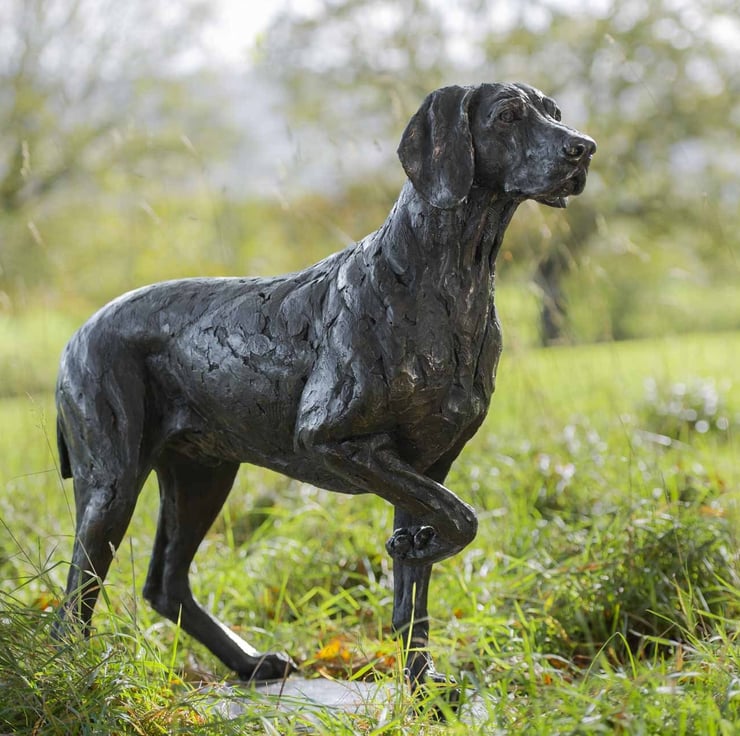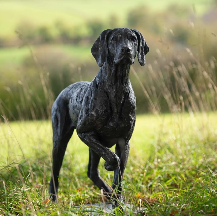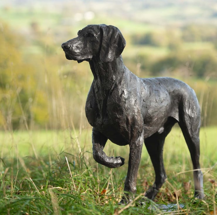 “This Pointing Weimaraner statue was a commission of a wonderful old boy named Monty. Monty was commissioned by his owners in the pointing pose that he often adopted when on walks with his family. He was sculpted a little younger, and with a base to allow the three-legged pose to stand on a patio or indoors.