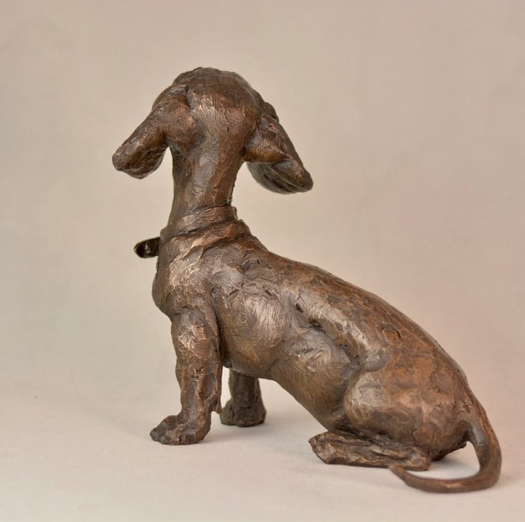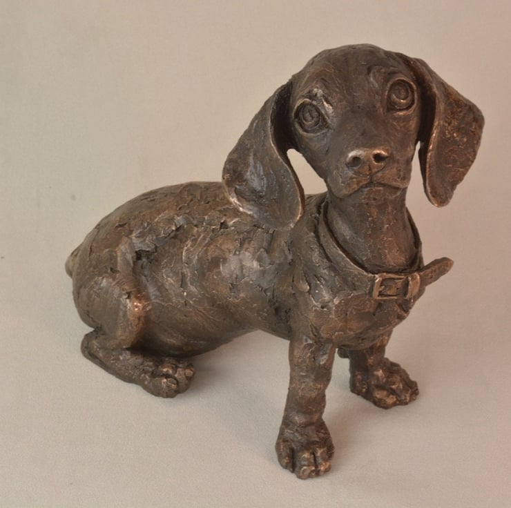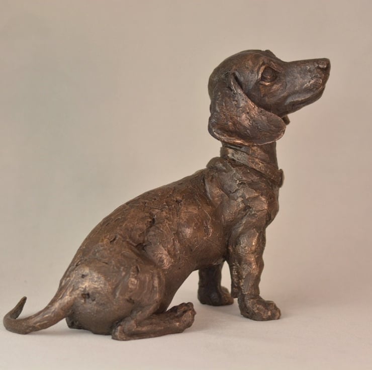 "The Sitting Dachshund Puppy was modelled on Pudding, the cutest little puppy who had gorgeous coloured markings. Its very rare that Im commissioned to do a very young dog and Pudding was delightfully sweet and loved to sit on your lap. It was also quite amusing to be sculpting her at the same time as my life-sized Great Dane!"
