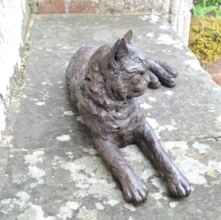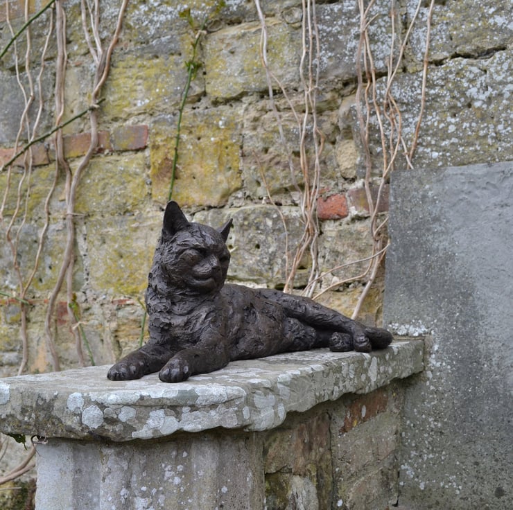 "The Lying Cat statue is a commission of Ollie, a British Blue. He was designed to lie on a wall, looking sleepy as he sunbathed in the sunshine. The Lying Cat was commissioned as a pair with the Curled Cat sculpture, which was based on Jack."