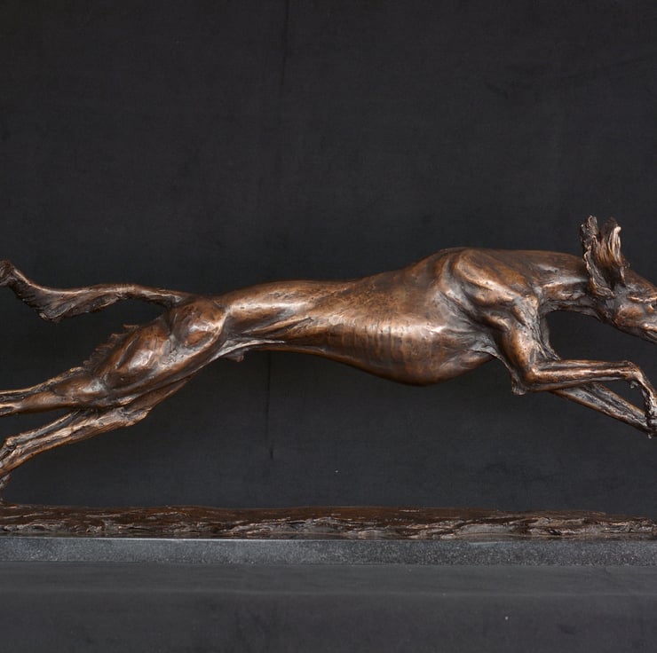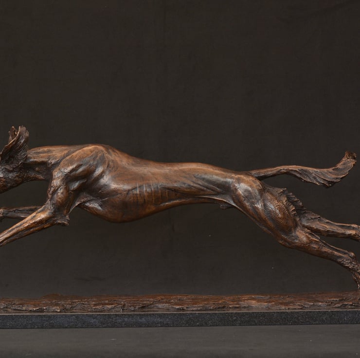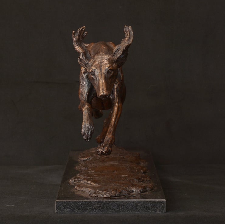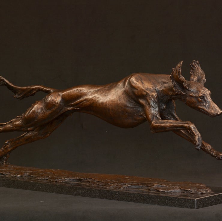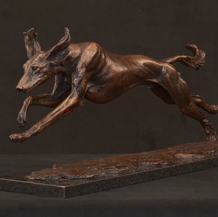 I have sculpted many dogs, mostly bespoke pieces, and I find it thrilling to discover an animal or a dog that evokes emotion with its spirit and form. I was particularly inspired by the images and story of the Shajarat-al-Hayat (‘Tree of Life’), in Bahrain. Seeing salukis in such a stunning setting, and picturing these magnificent dogs running across the desert, evoked a vivid picture in my mind, which I sought to pour into this saluki statue. Having loved sculpting this piece, I’m now tempted to sculpt a saluki, or perhaps a pair running together, at life-size, or larger.”