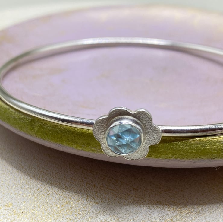 A rose cut sky blue topaz is the centre of the flower. Handmade sterling silver bangle.