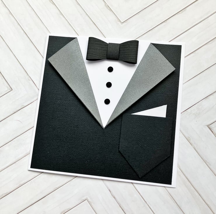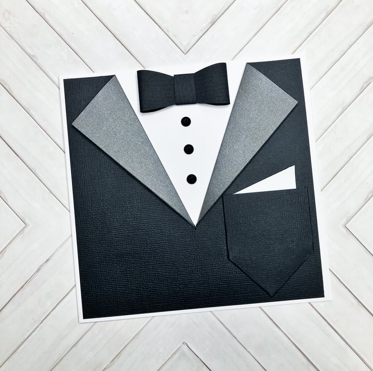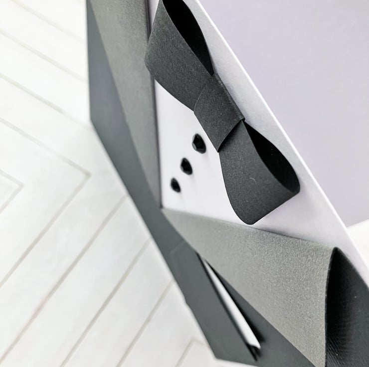 The lapels of the tuxedo are raised and folded over to reveal grey in the reverse. There is also a real pocket with a handkerchief peeking out and a black three-dimensional bow tie. Black embellishments create the effect of three buttons.