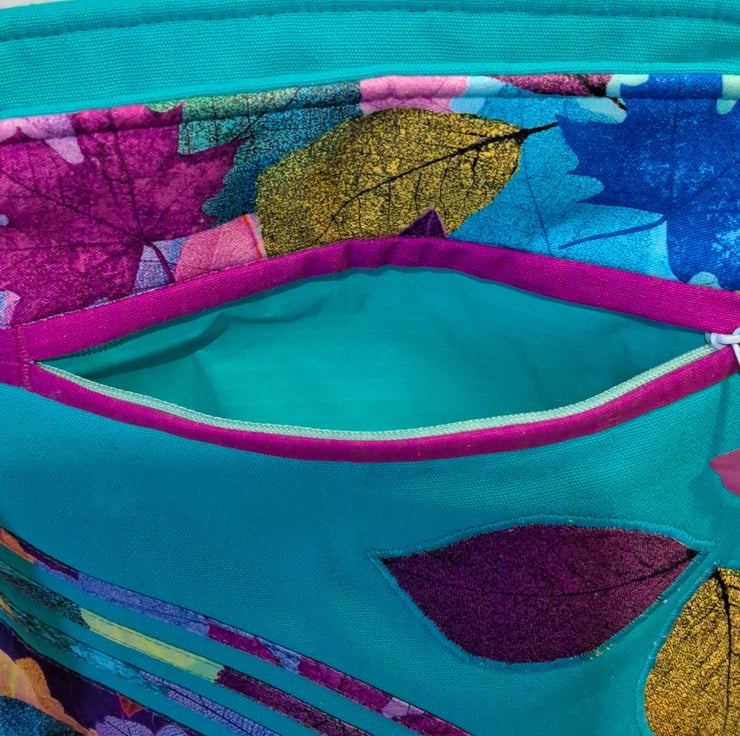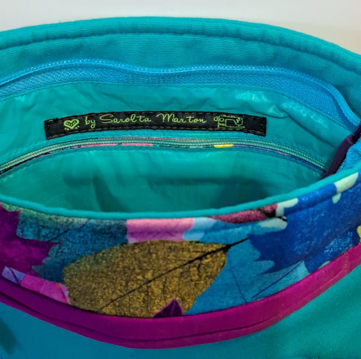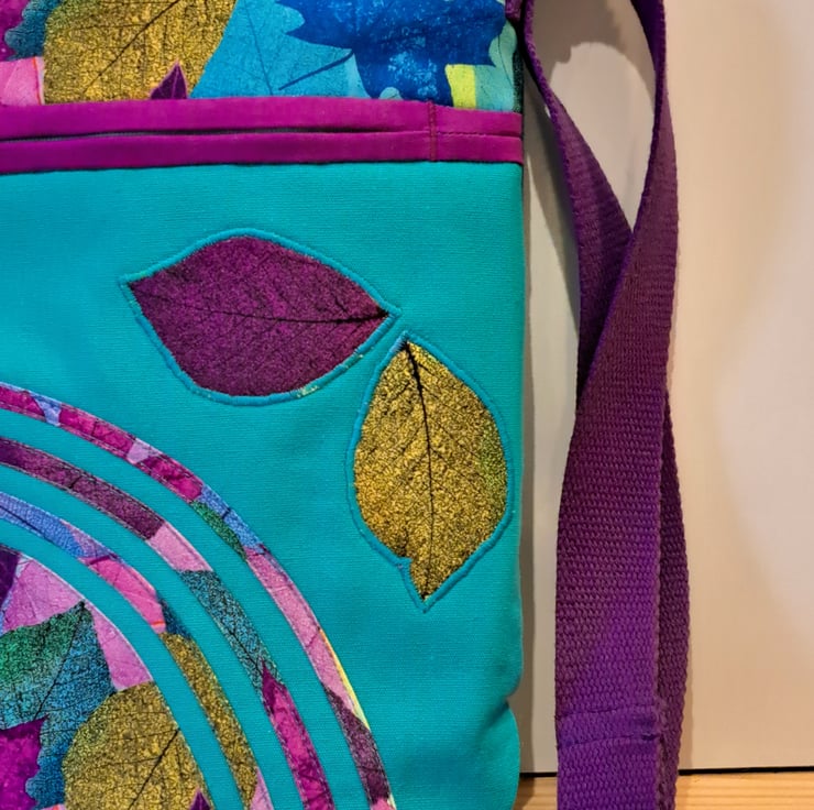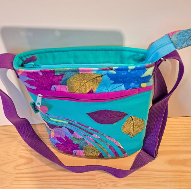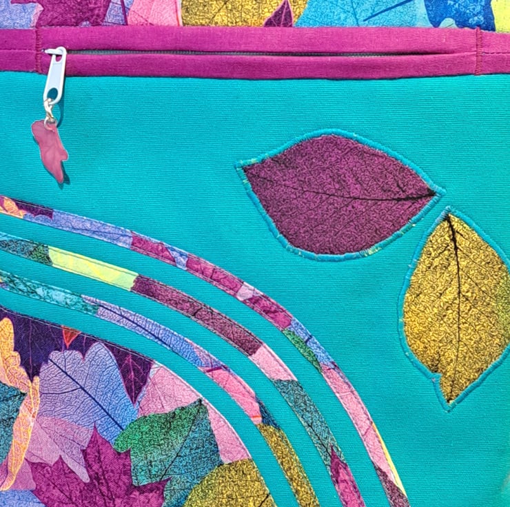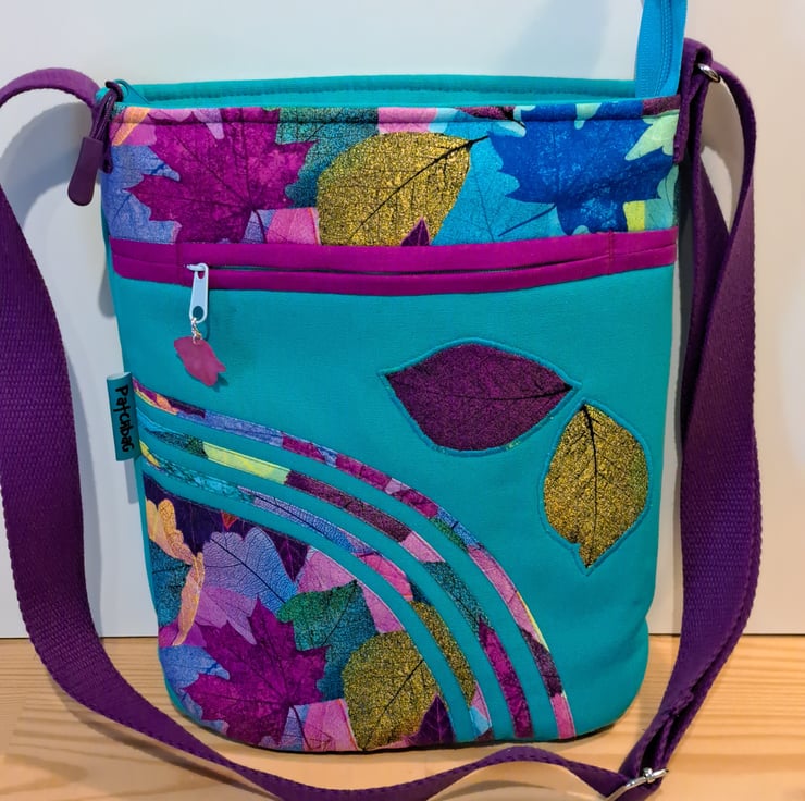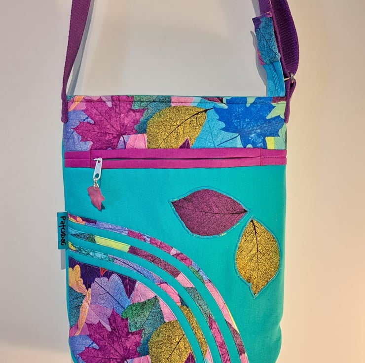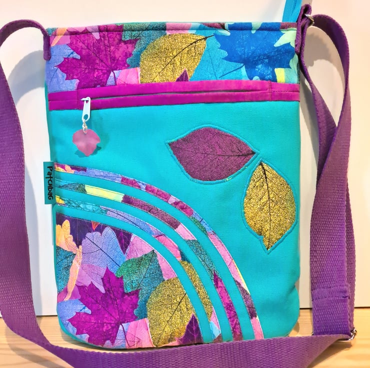 Unique handcrafted handbag with colorful leaves pattern on turquoise background. The bag made with patchwork, quilting and applique techniques. The main fabric is cotton canvas decorated with cotton fabric. The bag has outside and inside pockets with zipper closure, leaf charm on the outside zipper. The shoulder bag closing with zip on the top of the bag. The lining made from WATERPROOF fabric. The shoulder strap is adjustable with silver metal clasps. The main colours are turquoise, purple, lilac,blue and yellow. Dimenions of the handbag: hight 27cm, width 25 cm, depth 7cm on the bottom of the bag.