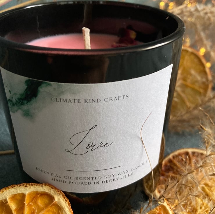 Fragranced with a Love blend - a soft scent blend including amber, thyme, jasmine, light oriental notes, clove, rose and vanilla.