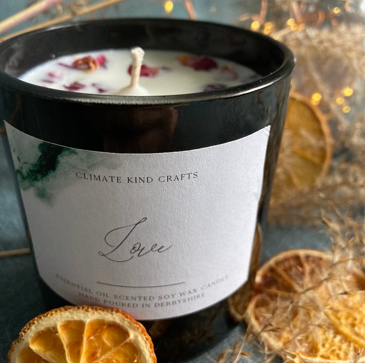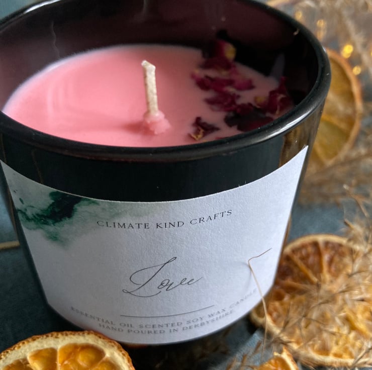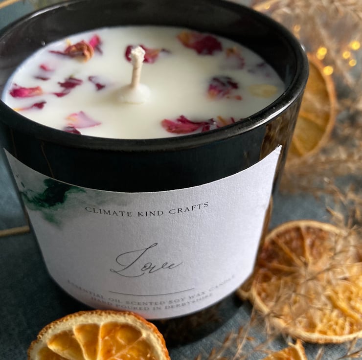 A 200ml vegan soy wax candle in black glass container decorated with dried pink rose petals. Available in pink or white wax.