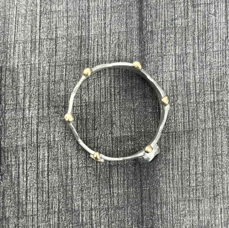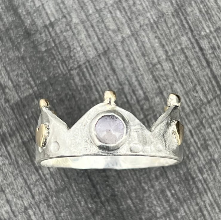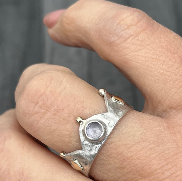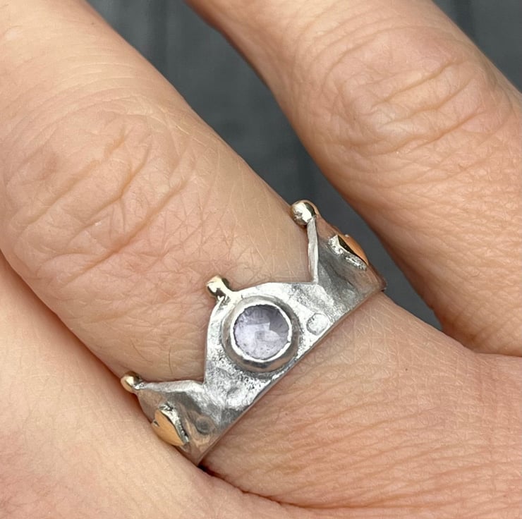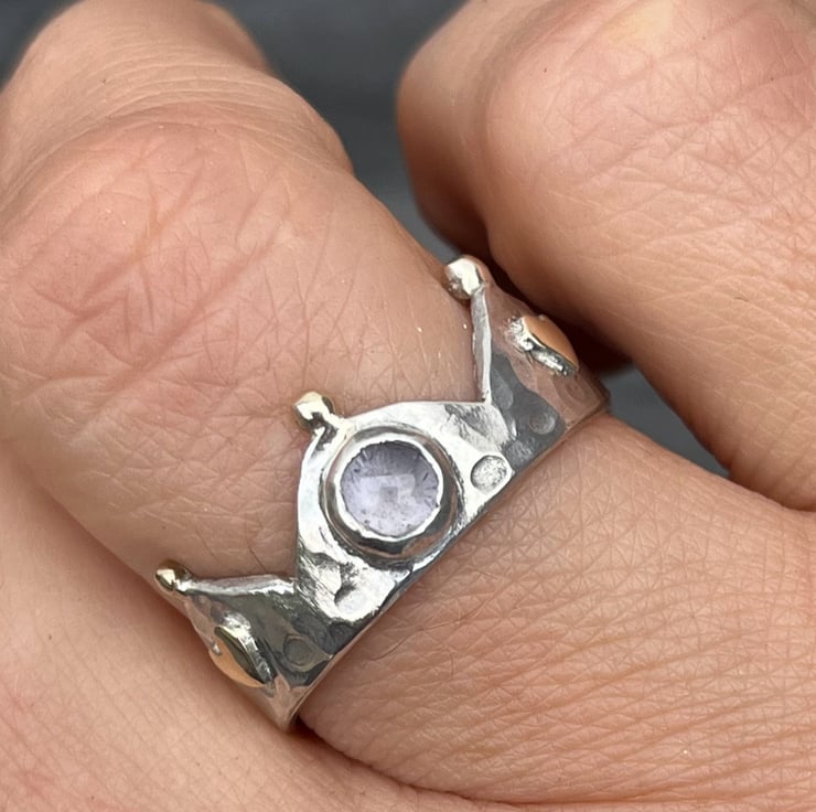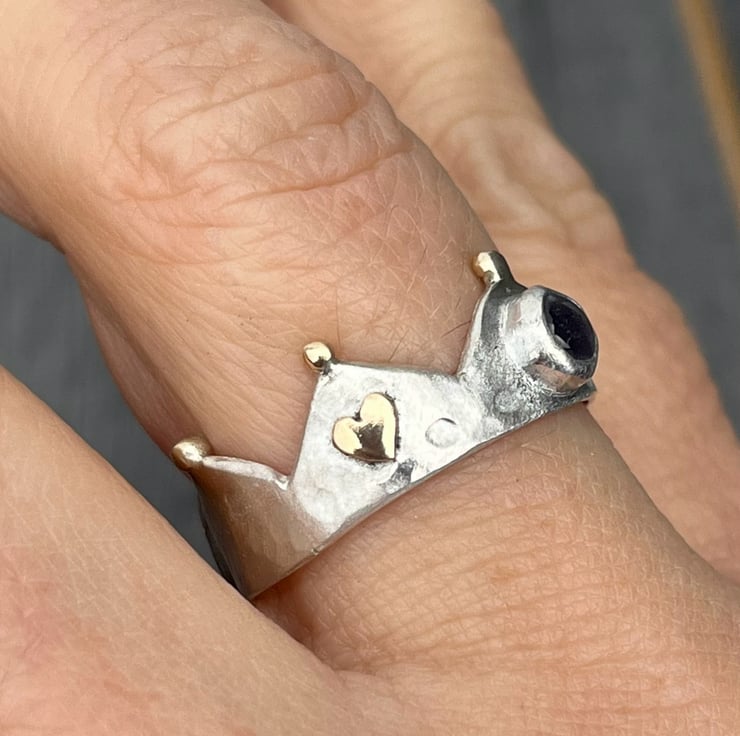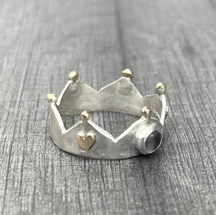 This hammered, Sterling Silver Crown Ring has 9ct gold detail including two gold hearts and a 5mm wide, round cabachon Iolite. The width of the ring is approximately: 9mm. Please let me know the ring size you require at Checkout and if possible, whether you used a narrow ring sizer (approximately: 4mm wide or a wide ring sizer (approximately: 6mm). This ensures a perfect fit. Other stones available, please message to enquire.