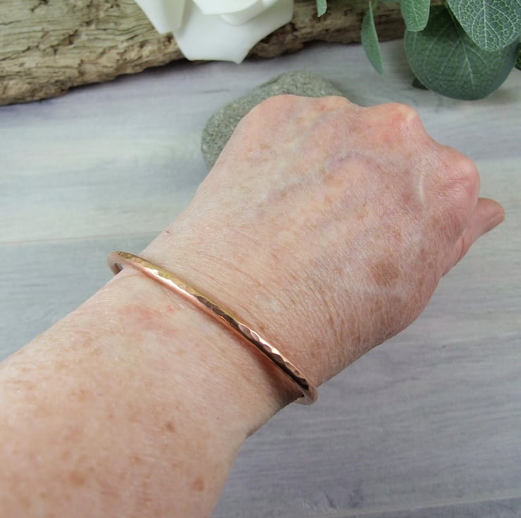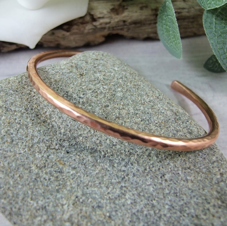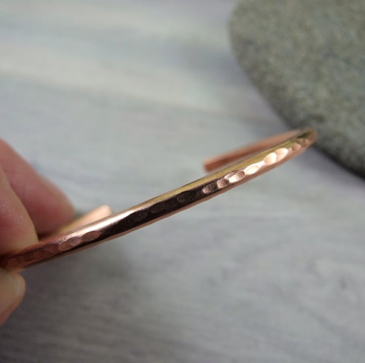 I have made the bangle from 3mm thick solid pure copper shaped and forged by hand and given a hamered textured finish.