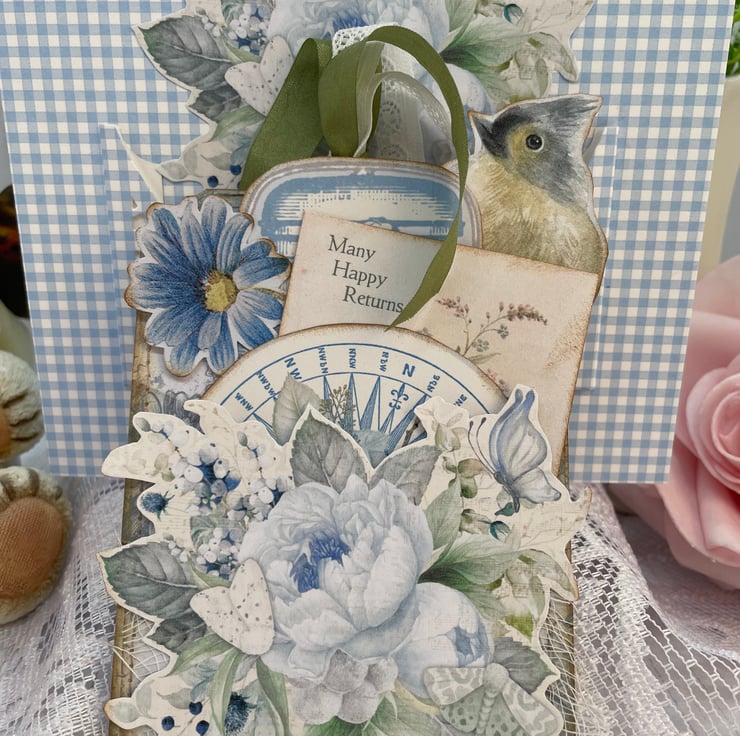 Gingham card with lace die cut pocket holds a tag with a pocket and loaded with 5 pieces of ephemera. Sage green seam binding and lace for tying. A matching image is applied to the front of the card along with the sentiment banner reading ‘Happy Birthday’