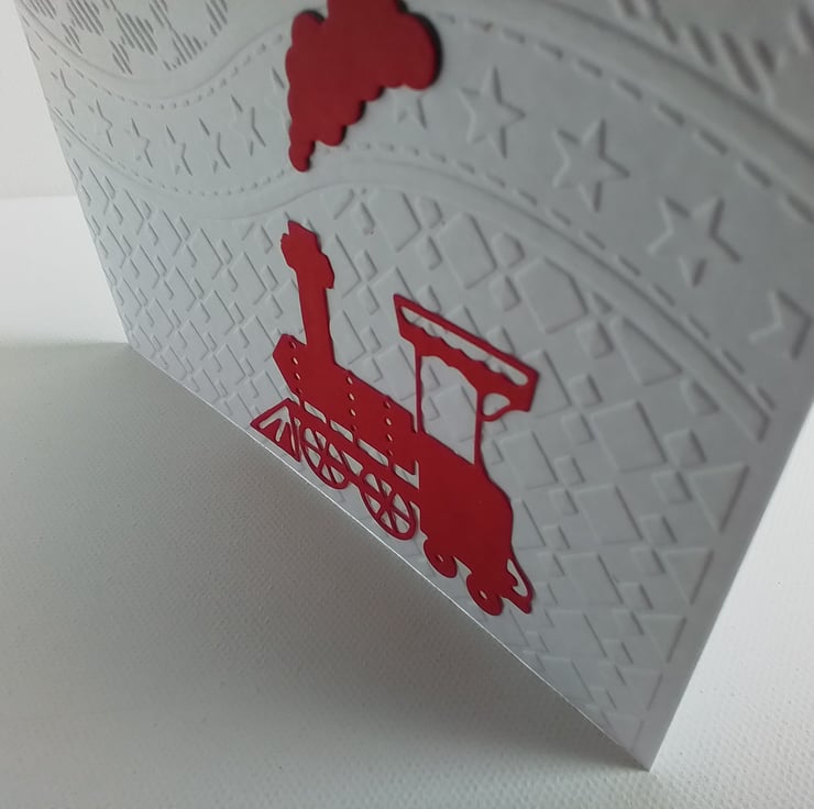 A handmade, embossed card suitable for any occasion is topped with a red train and smoke coming from the chimney.
