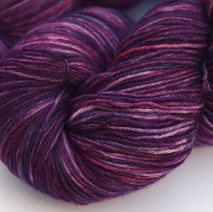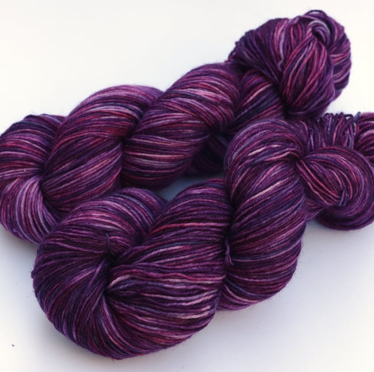 Mottled berry purples and pinks with lighter sections. This is a standard 4-ply 'sock' yarn with a nylon content to add robustness. There are two skeins available, price shown is for one. These skeins were dyed together but have differences in colour proportions and blending so if you plan to use both in the same project, alternating skeins as you work is recommended. Photos have been taken and edited in bright natural light.