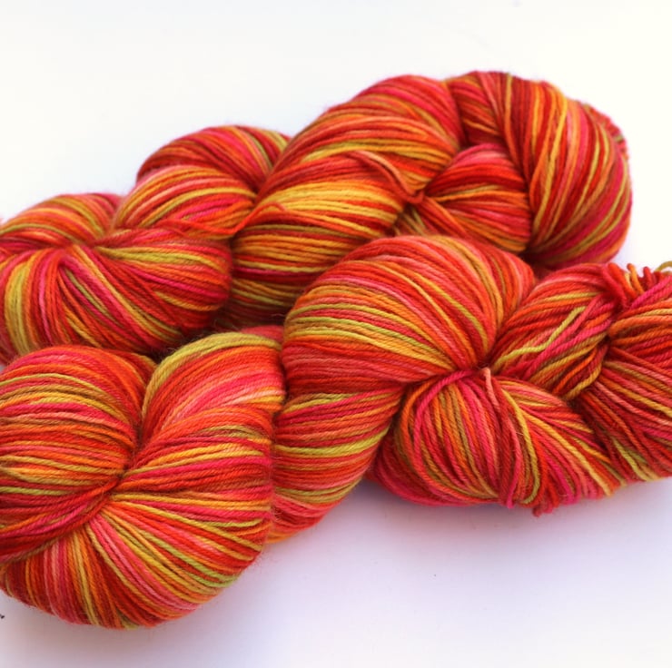 Cheery shades of yellow, orange and pink with some yellow-green hints. This Bluefaced Leicester superwash yarn is soft with a very slight lustre. There is one skein left. Photos taken and edited in bright natural light.