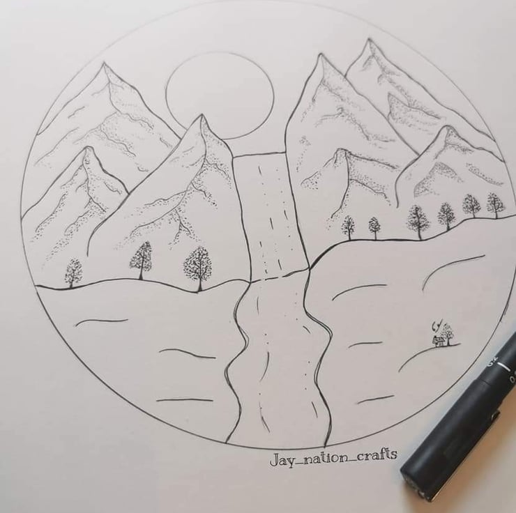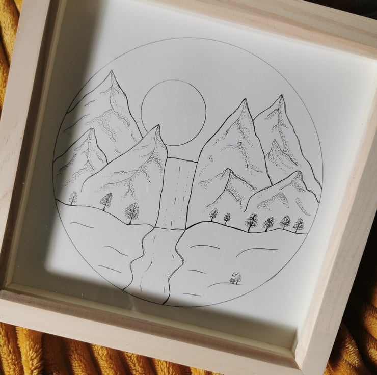 Original drawing of a stunning mountain range with flowing river, dot work trees and a adorable little house in the forefront. All nicely wrapped up in a drawn circle boarder to finish off the piece, this comes in a box frame with glass front, sizes approximately 21.5 cm by 21.5 cm, along with a hanging attachment to the back of the frame.