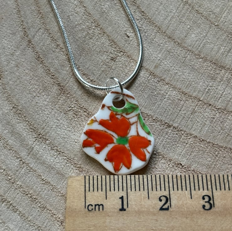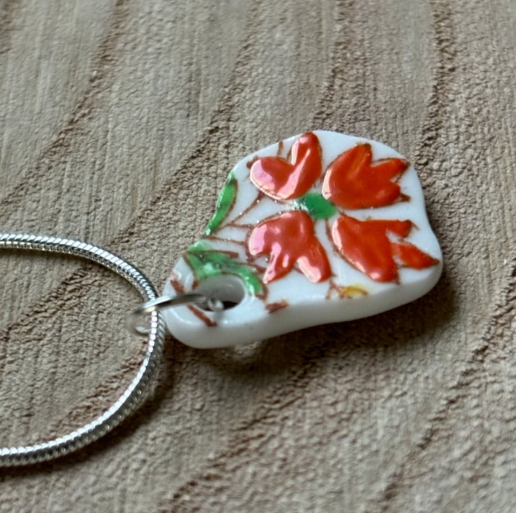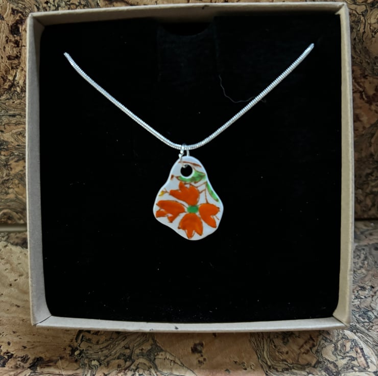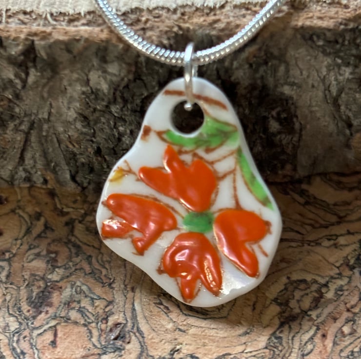 This pendant is made from the edge of the plate. Hand-painted bright orange flower. Sides and back sanded and sealed with eco friendly matt varnish. Unique, one of a kind pendant necklace.