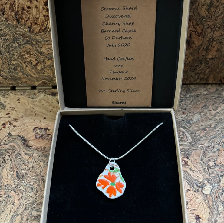 Hand crafted Jewellery and framed artworks using pre loved and discarded ceramics. Ceramic material will show signs of wear and damage. Entire process is a creative experience from discovery to final picture, nothing planned or preconceived. All materials personally collected from river banks, charity shops, roadside, woods, recycle centres, beaches, wherever dropped, dumped or donated ceramics are found, cleaned and shaped into new stories. Each piece comes with a short bio of where the ceramic came from, date found and re-created. Some shards collected are used as found, others are cut randomly which shape the final work. Every piece is individual, nothing replicated, however, due to repetitive patterns in ceramics there will be some similarity but only through the ceramic material not in the final piece.
