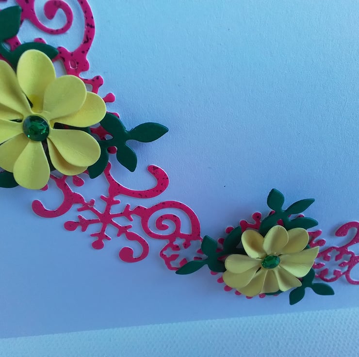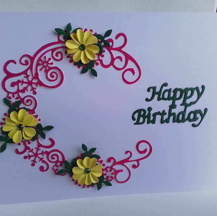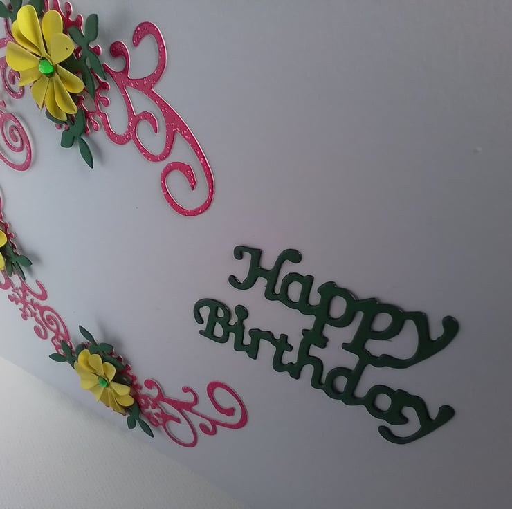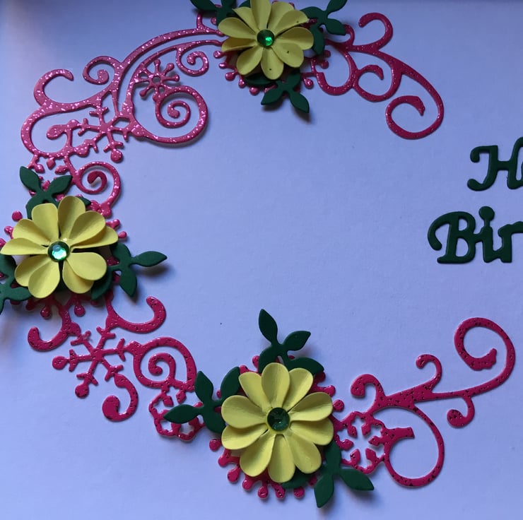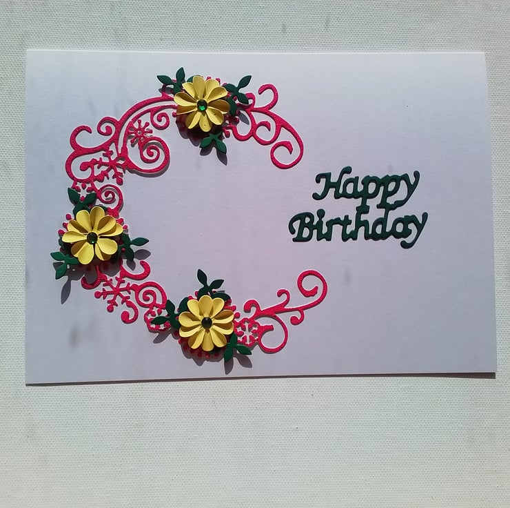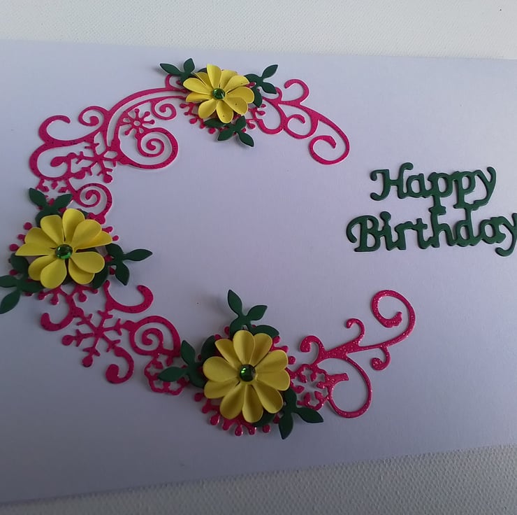 A beautiful handmade Birthday card with a cerise, sparkly half circle with handmade yellow flowers dotted around.