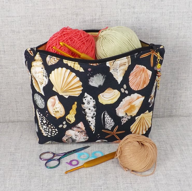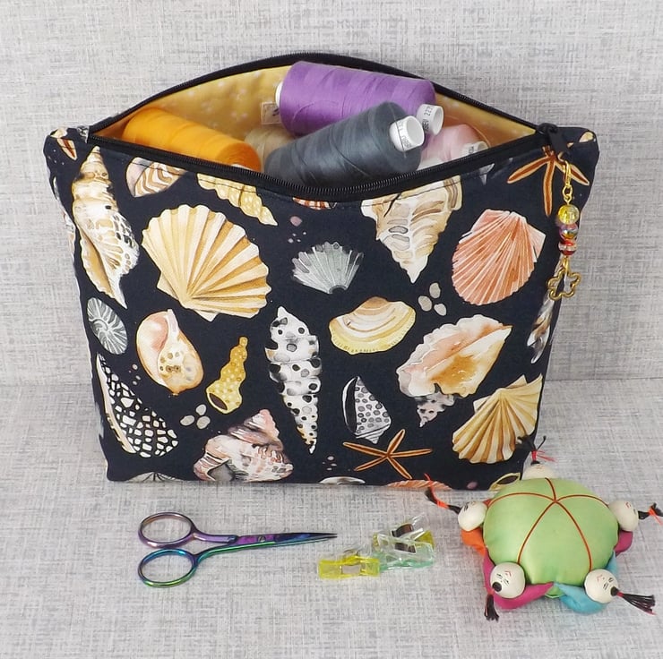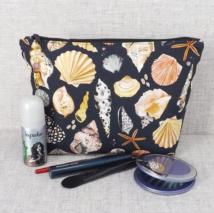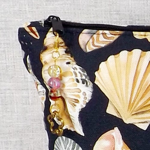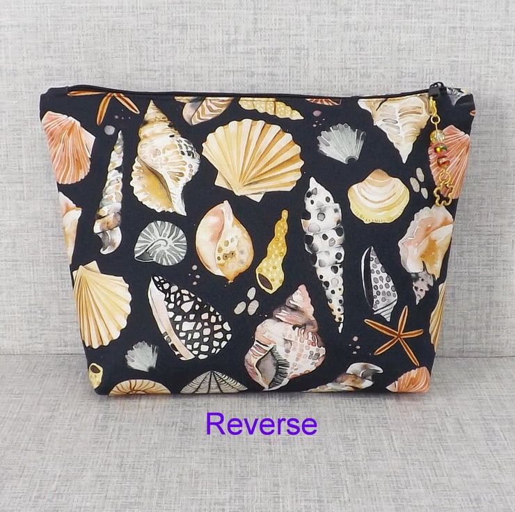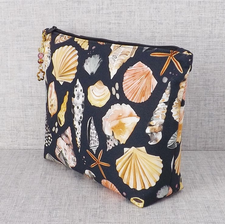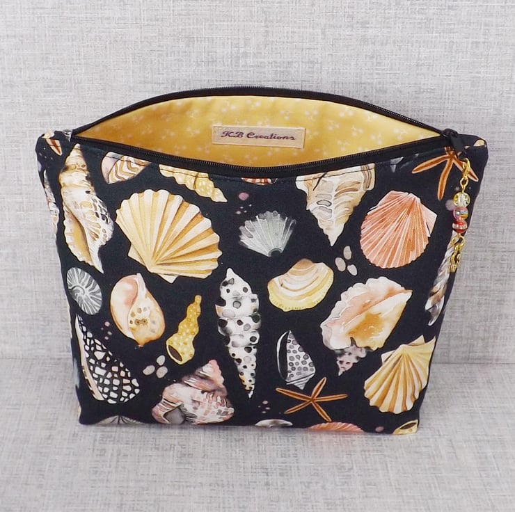 A large sized zipped pouch made from cotton canvas fabric with shells on a black background.